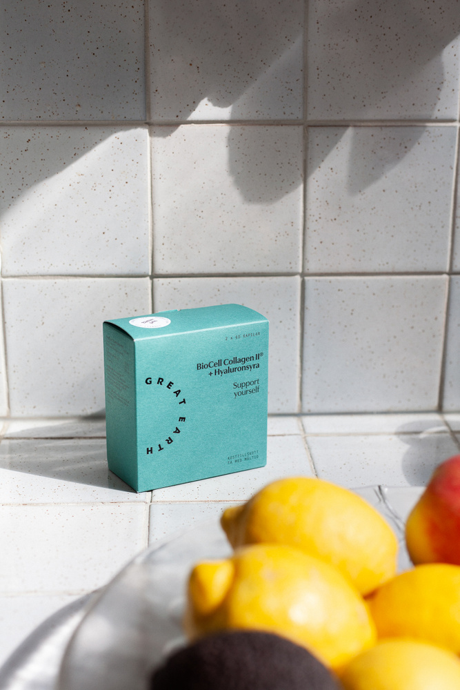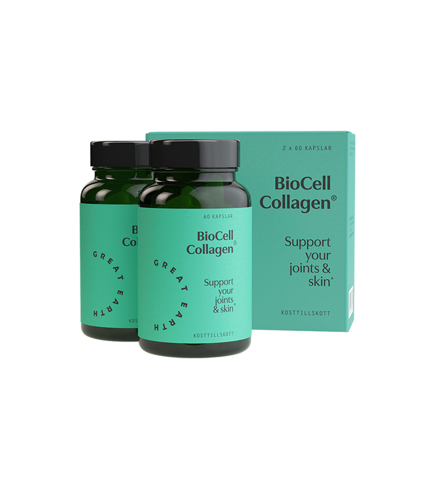 Collagen production declines year by year. Collagen is a protein that helps hold the body’s connective tissue structure together—think of it as the body’s natural “glue” that helps keep you moving and your skin feeling supple. BioCell Collagen contains type II collagen, which is important for skin elasticity and is the dominant collagen type in joint cartilage; chondroitin, naturally found in cartilage and connective tissue; and hyaluronic acid—well known from hydrating skincare. The capsules also contain vitamin C, which contributes to normal collagen formation for the normal function of cartilage and skin. In other words: a great choice if you live an active life and want to care for your joints, or if you’d like to give your skin a little extra support.Normal leveranstid är 1 – 5 arbetsdagar från det att vi har bekräftat din beställning via e-post. Vid beställningar som registreras under helgdagar räknas leveranstiden från den första arbetsdagen efter avslutad helgdag.