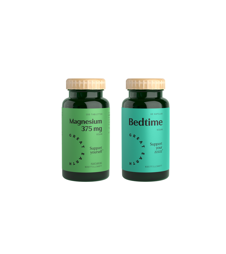 Sömnrubbningar är ett av de mest växande problemen idag. Därför har vi nu satt ihop ett paket med två av våra absoluta bästsäljare med fokus på lugn och ro och bättre sömn. De två tillskotten arbetar tillsammans för att ge bästa möjliga förutsättningar för dig att vakna pigg och utvilad.- Bedtime - För godare sömn
