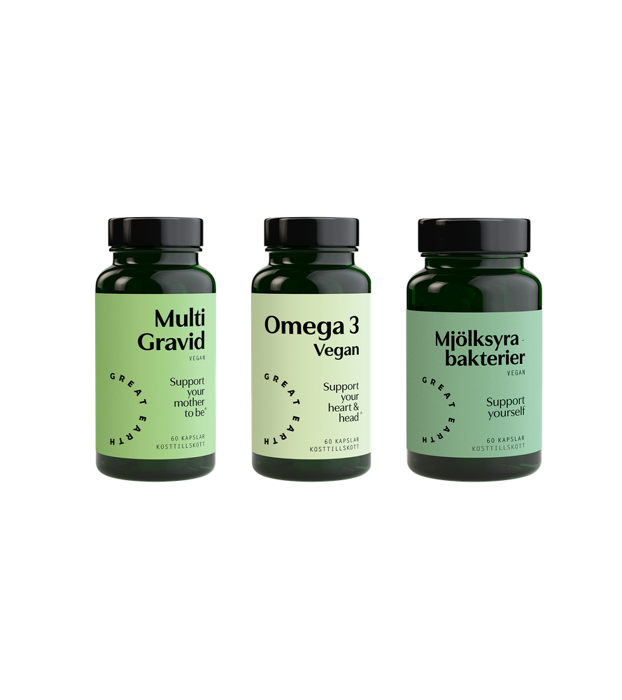 - Ett fantastiskt paket som stöttar dig och det lilla livet under graviditeten, så att du kan fokusera på att göra det bästa av den väntande tiden. Alla tillskott i paketet är godkända för gravida och fria från tungmetaller och föroreringar. Vår Omega 3 kommer från mikroalger och kommer i en cellulosa-kapsel, helt unik på marknaden. Många kapslar på marknaden innehåller karragenan (E407). Även om det är en godkänd tillsats, har det funnits diskussioner kring hur karragenan kan påverka magen och bidra till inflammation hos känsliga personer.