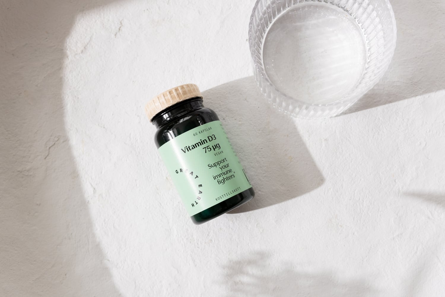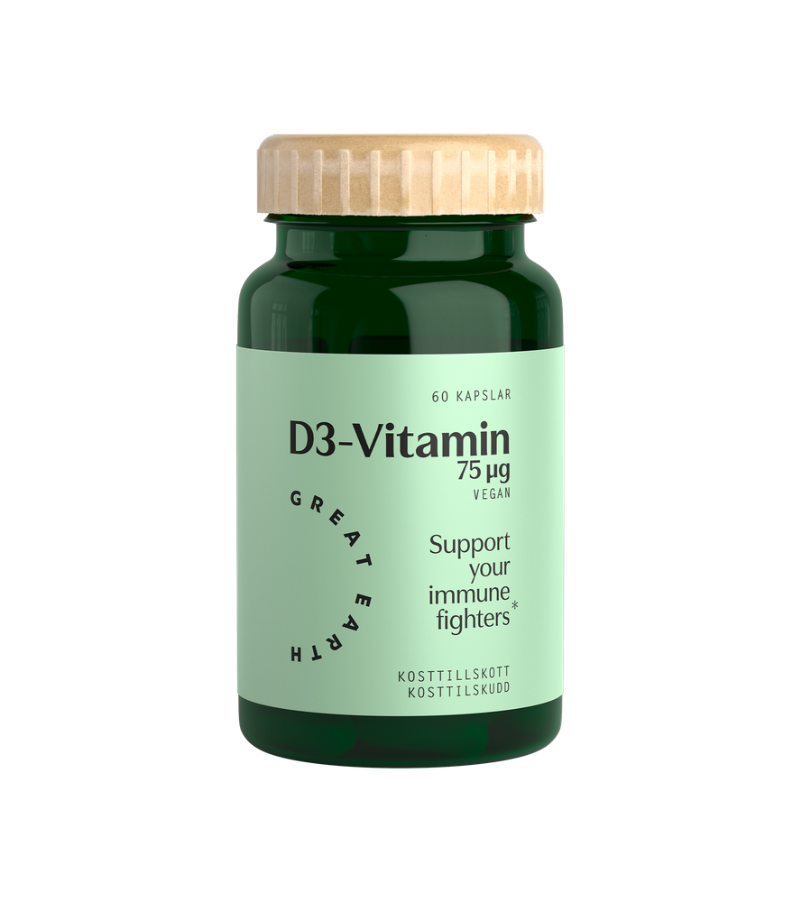 Many people in the Nordic countries get too little vitamin D during the winter months, as it’s naturally produced in the skin when we’re exposed to sunlight. Vitamin D contributes to the maintenance of normal bones and normal muscle function, and to the normal function of the immune system. Vitamin D3 from Great Earth is vegan and derived from algae. Psst the product is also registered with The Vegan Society!Normal leveranstid är 1 – 5 arbetsdagar från det att vi har bekräftat din beställning via e-post. Vid beställningar som registreras under helgdagar räknas leveranstiden från den första arbetsdagen efter avslutad helgdag.